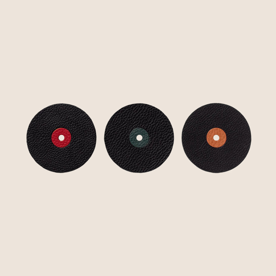 センターラベルの3色の革と、レコード本体のネイビーの革の比率が本物のレコードと同じなので、ミニサイズのレコードのようでとてもかわいい。